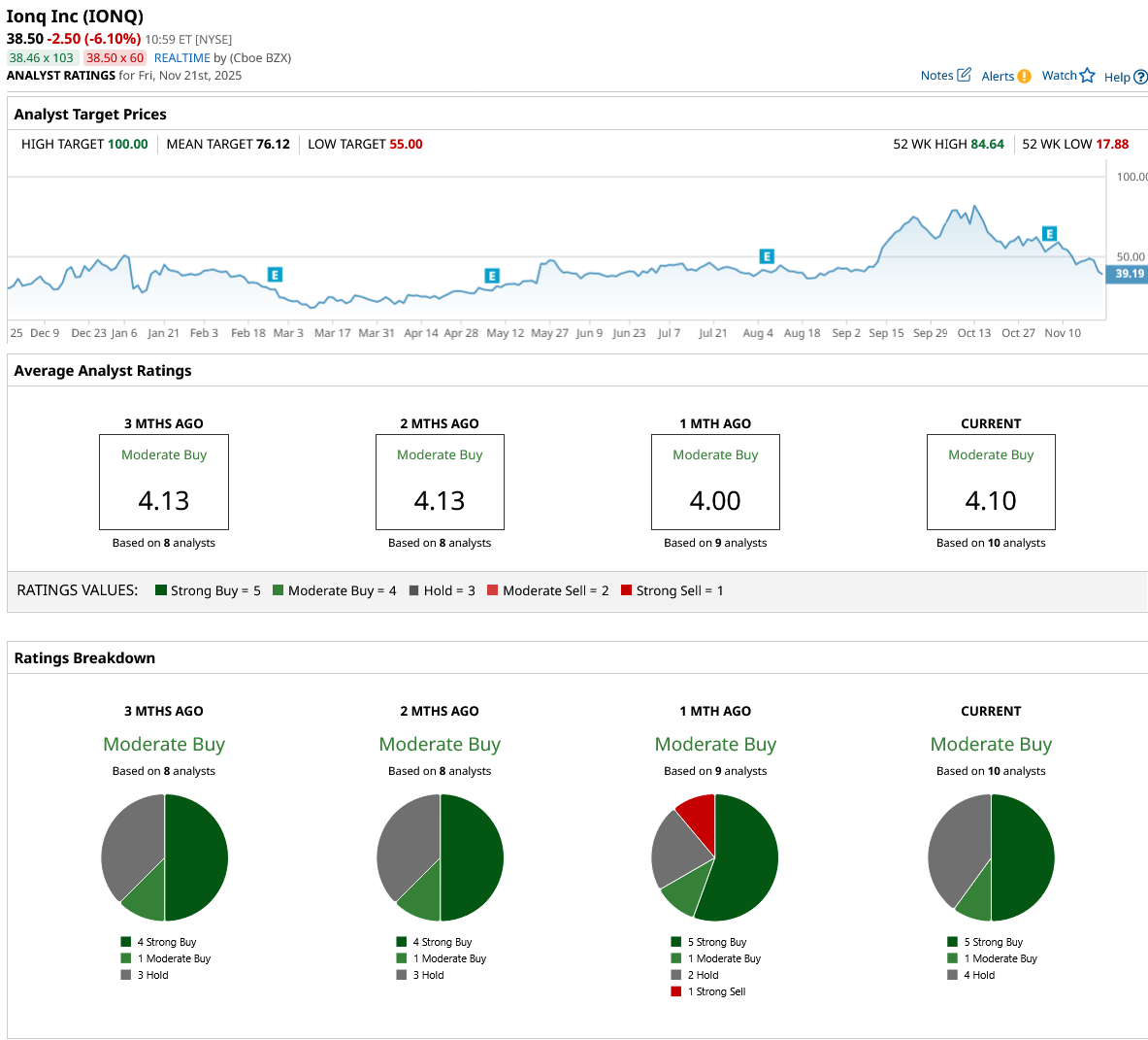 Out of the 10 analysts covering INOQ stock, five recommend “Strong Buy,” one recommends “Moderate Buy,” and four recommend “Hold.” The average IONQ stock price target is $76.12, above the current price of $39.