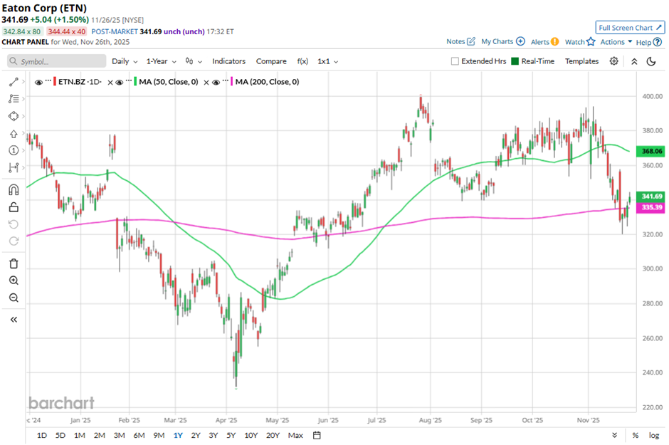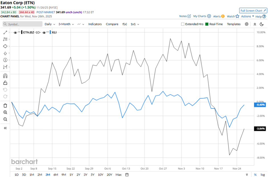 Shares of the Dublin, Ireland-based company have fallen 14.5% from its 52-week high of $399.56. Eaton’s shares have declined 2.9% over the past three months, underperforming the Industrial Select Sector SPDR Fund’s (XLI) marginal dip over the same time frame.