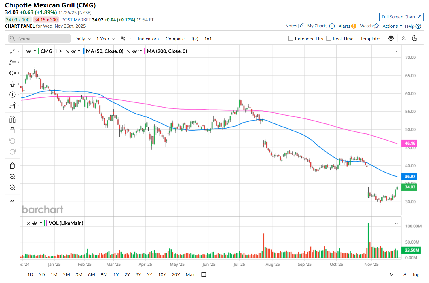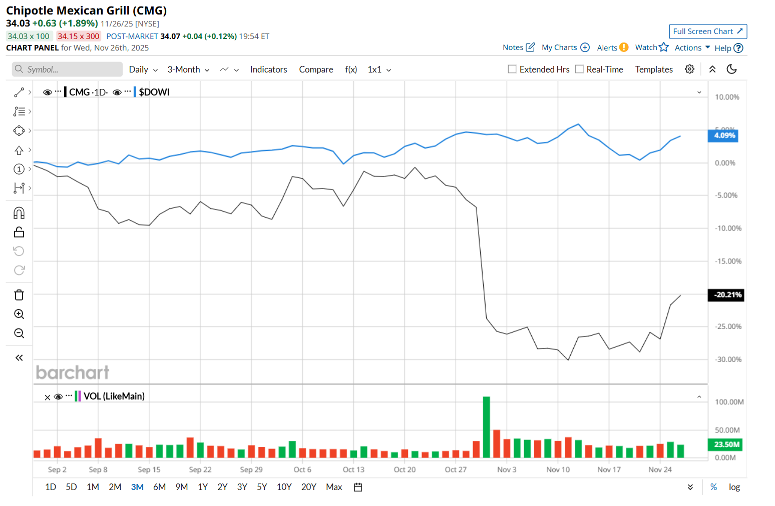 Despite its notable strength, this fast food company has slipped 49% from its 52-week high of $66.74, reached on Dec. 12, 2024. Shares of CMG have declined 20% over the past three months, considerably trailing behind the Dow Jones Industrial Average’s ($DOWI4.4% rise during the same time frame.