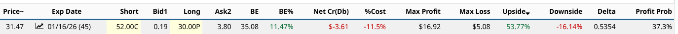 Here’s IBIT. I went out to the middle of next year for this one. I accepted some downside (15%) but kept the cost low (2.2%). And the upside of more than 30% makes for a decent 2:1 ratio with the risk.