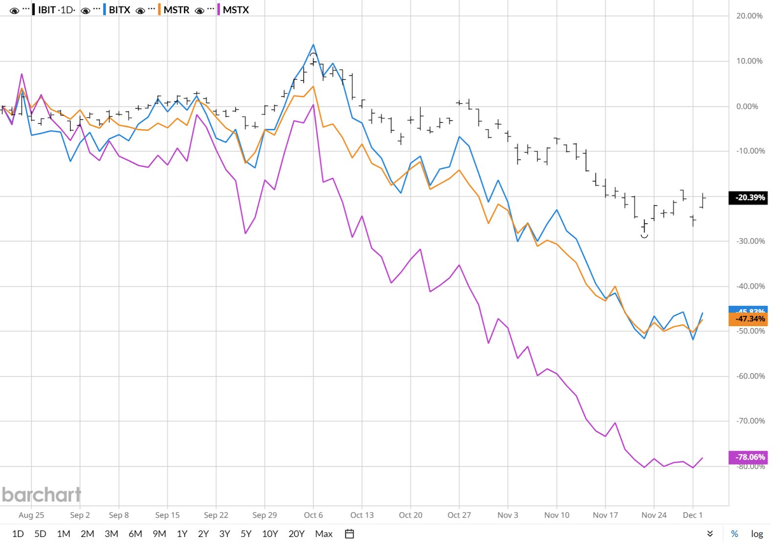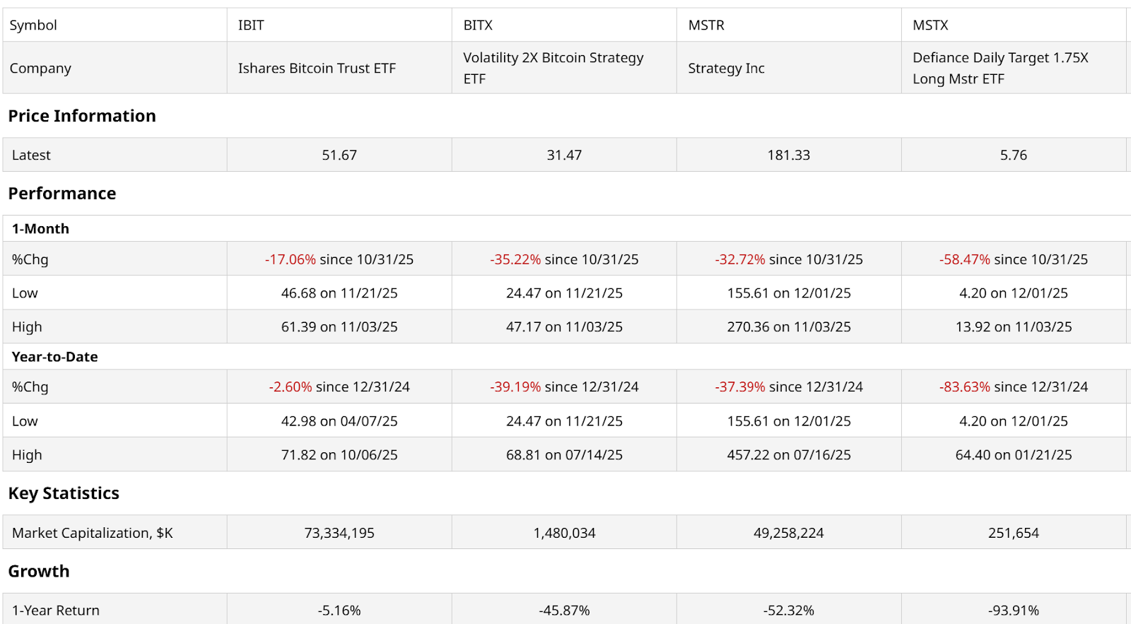 Strategy (MSTR), the stock formerly known as MicroStrategy, Michael Saylor’s Bitcoin-buying machine. Recently, for obvious reasons, that ship has sailed south, if you will. In the table above, I’ve also included a leveraged version of MSTR. But for the sake of the squeamish in the audience, I’ll refrain from delving into the possibilities of using options on a leveraged stock ETF of a Bitcoin Treasury company.