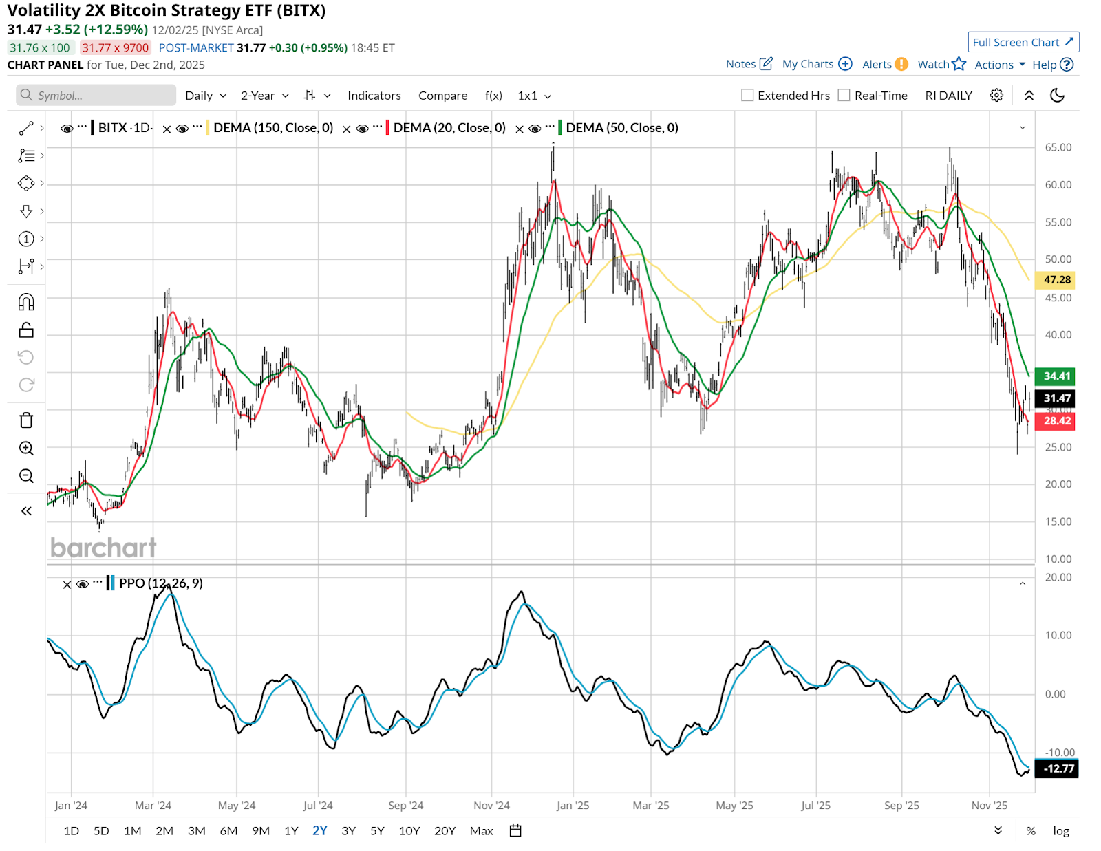 The Volatility 2X Bitcoin Strategy ETF (BITX), a leveraged ETF tracking Bitcoin’s price. It moves about two times as much as Bitcoin does on a daily basis. That’s a big negative when the underlying asset falls as quickly as Bitcoin just did.