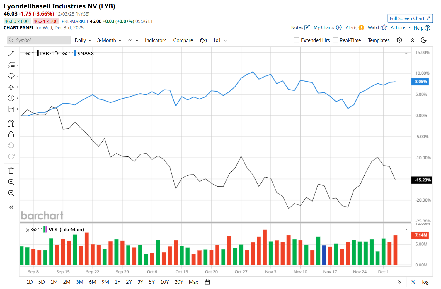 This chemical company has dipped 42.5% from its 52-week high of $80, reached on Dec. 4, 2024. Shares of LYB have declined 15.1% over the past three months, considerably lagging behind the Nasdaq Composite’s ($NASX9.1% rise during the same time frame.