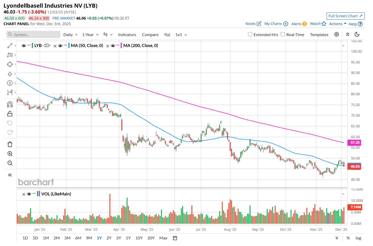 To confirm its bearish trend, LYB has been trading below its 200-day moving average over the past year and has remained below its 50-day moving average since late July, with minor fluctuations.
