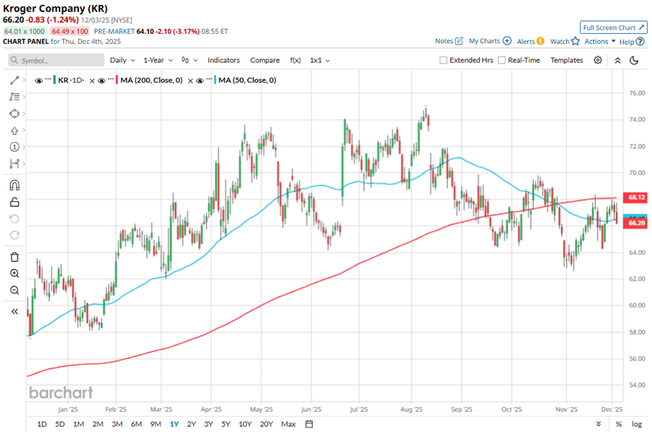 Kroger reported strong Q3 2025 results on Dec. 4, including a 2.6% increase in identical sales without fuel and 17% growth in eCommerce sales. Investors also reacted positively to Kroger raising the lower end of its full-year adjusted EPS guidance to a new range of $4.75 to $4.80, supported by adjusted FIFO operating profit of $1.09 billion. Confidence was further boosted by management’s expectation that the eCommerce business will become profitable in 2026 and by continued share repurchases under the remaining $2.5 billion authorization.