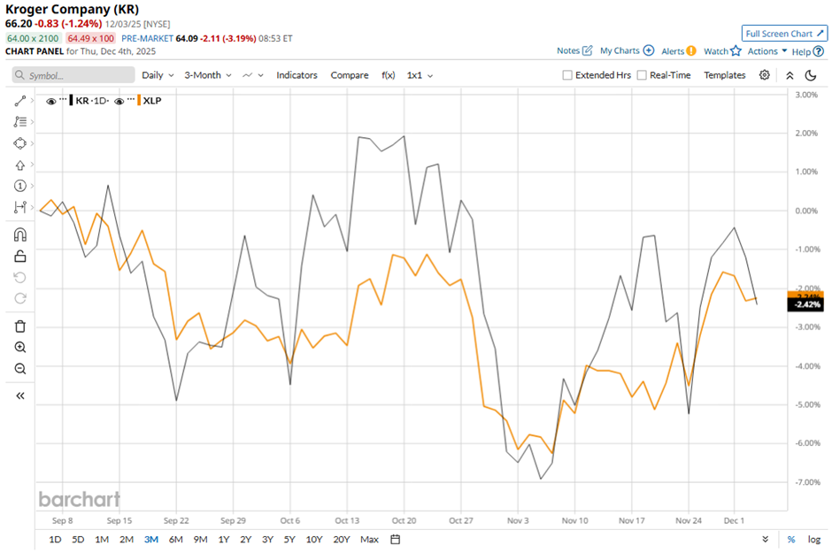 Shares of the Cincinnati, Ohio-based company have pulled back 14.6% from its 52-week high of $74.90. Shares of Kroger have declined 5.7% over the past three months, lagging behind the Consumer Staples Select Sector SPDR Fund’s (XLP) 2.3% decrease over the same time frame.