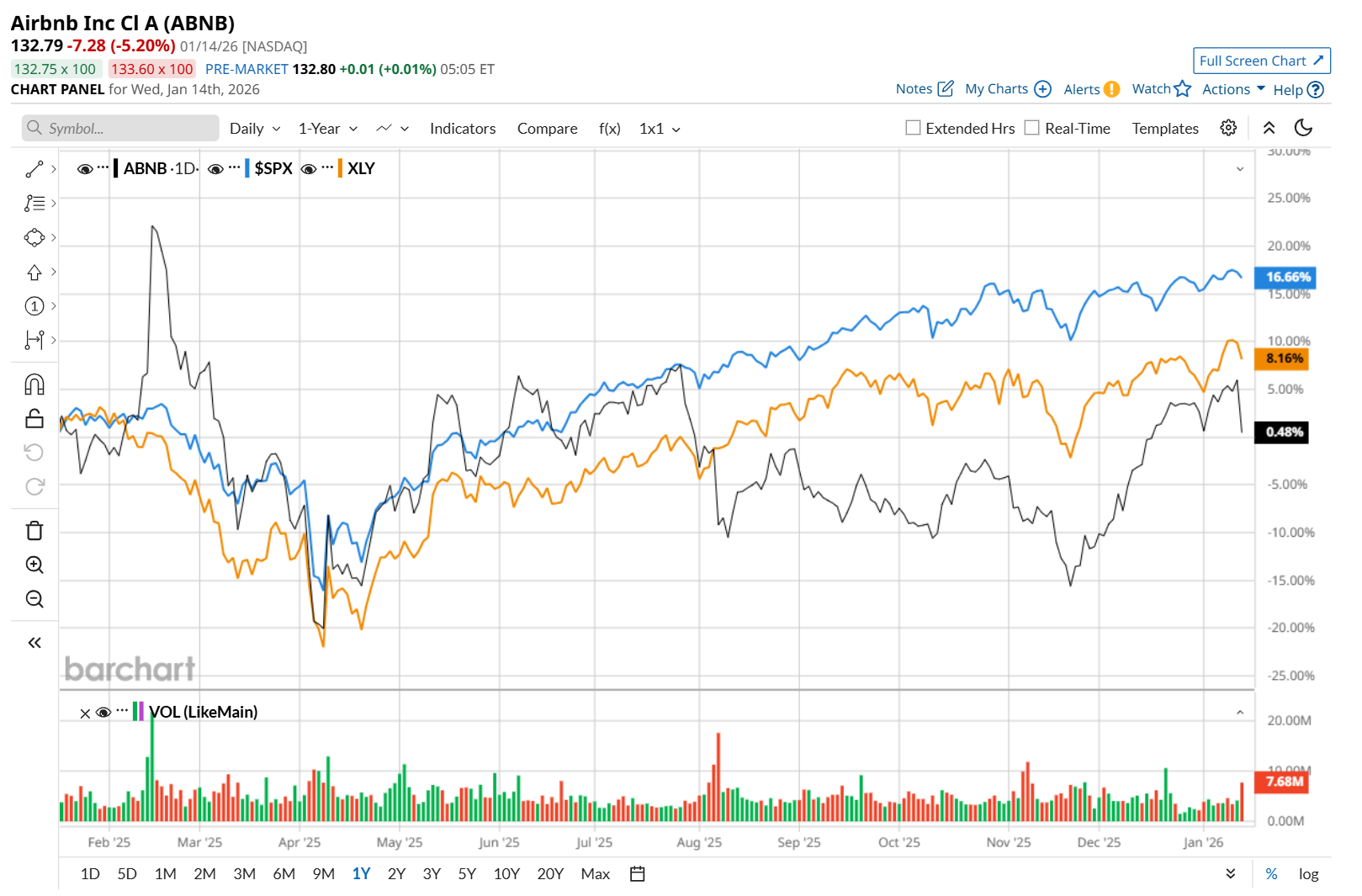 Airbnb has gained 4.1% over the past 52 weeks, lagging behind both the S&P 500 Index's ($SPX) 18.6% return and the State Street Consumer Discretionary Select Sector SPDR ETF’s (XLY) 10.3% uptick over the same time period.