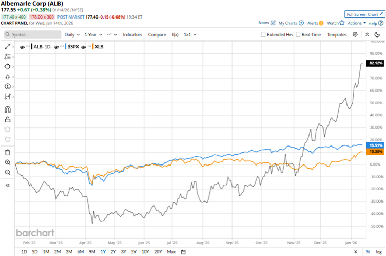 Based on a rebound in lithium prices from their lows, driven by strong demand in the energy storage industry, Albemarle’s stock has surged robustly. Over the past 52 weeks, the stock has gained 91.7%, and over the past six months, it has climbed 147%. On the other hand, the broader S&P 500 Index ($SPX) has increased by 18.6% and 10.5% over the same periods, respectively. Hence, Albemarle has outperformed the broader market over the past year.