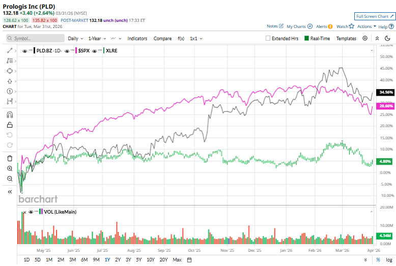 Over the past 52 weeks, PLD stock has surged 19.7%, outpacing the S&P 500 Index ($SPX) rose 17%, and the State Street Real Estate Select Sector SPDR ETF (XLRE), which has dropped 1.4%.